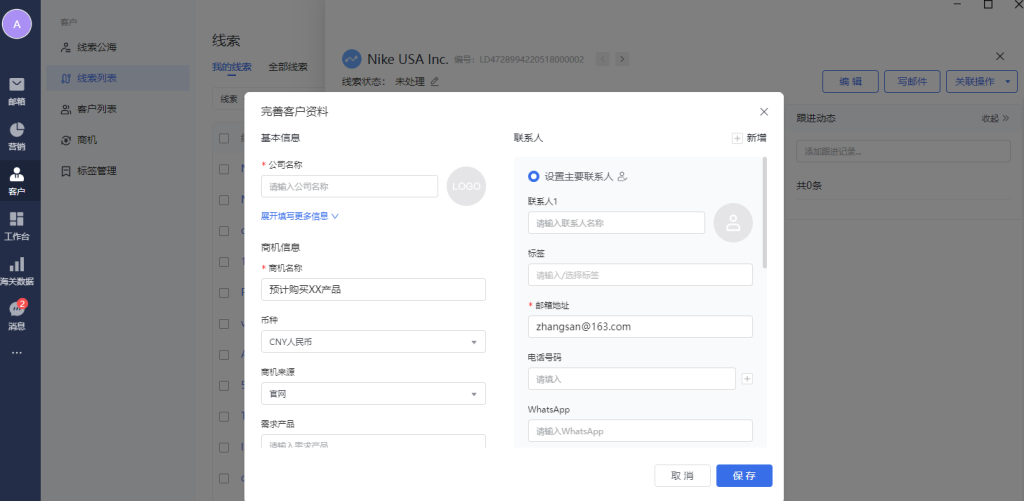 线索列表支持手动新建、海关数据导入、往来邮件推荐、个人通讯录导入、发送营销邮件时勾选自动同步营销邮件收件人到线索管理,并进行后续的更多管理操作。